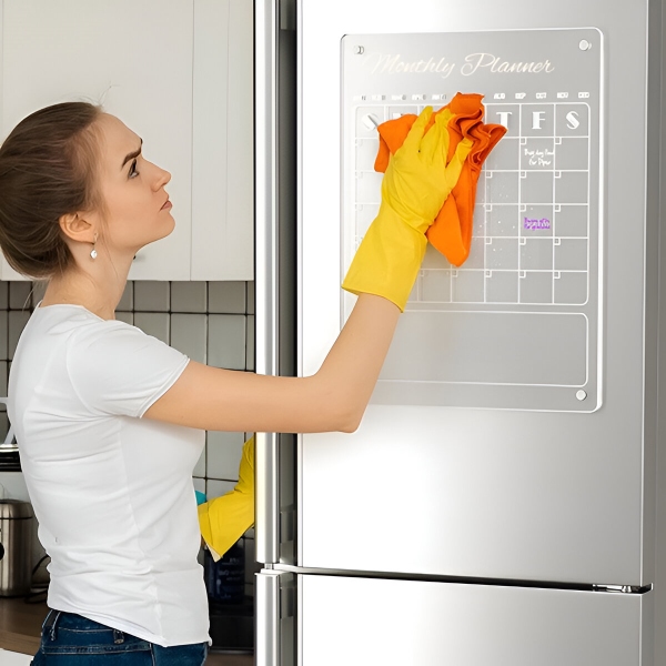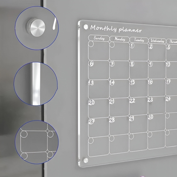 Papierowe planery kończą się po miesiącu i lądują prosto w koszu. Przezroczysta akrylowa powierzchnia wyciera się całkowicie do czysta w kilka sekund za pomocą dołączonej ściereczki – bez śladów, bez plam, bez pozostałości. Powierzchnia jest odporna na zarysowania i plamy, dzięki czemu pozostaje krystalicznie czysta po setkach cykli wycierania.