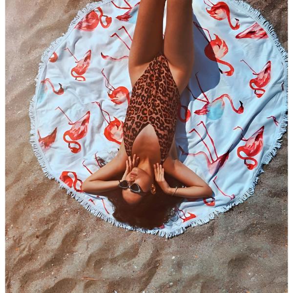 Okrągły ręcznik jest przeznaczony do relaksu na plaży lub przy basenie, ale można go również nosić zawiązany wokół ciała jak plażowe pareo.
