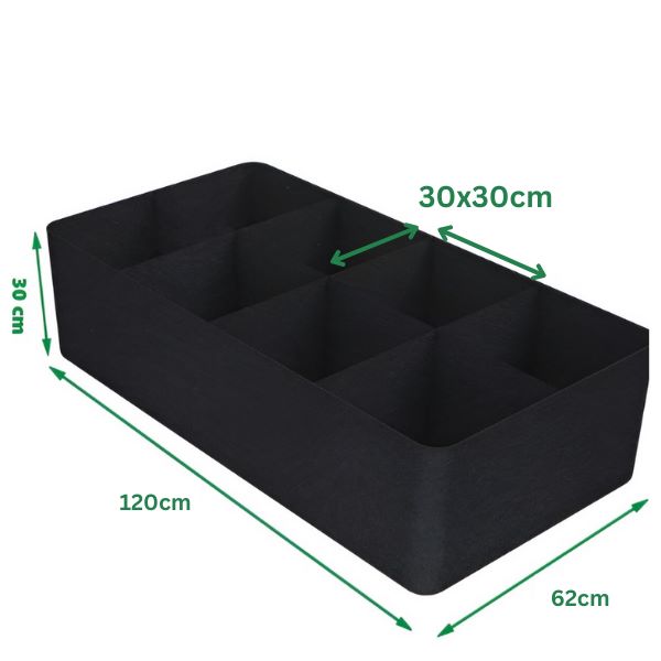 Ta podniesiona grządka ogrodowa z tkaniny ma konstrukcję z 8 siatkami o wymiarach 120 x 62 cm i wysokości 30 cm.